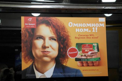 The natural light of the real world disappears, replaced with neon advertisements plastered to every inch of wall space. Everything here has been planned and executed with the mentality that sacrifice is not true sacrifice if in the name of ‘Mother Russia’. President Vladimir Putin’s new biography is most prevalently promoted, his face radiating through the fluorescent tubes. Beside him, a jolly looking ginger is displayed chowing down on more sausages: “Om nom nom”, the advertisement reads. Down still, deeper into an unknown which seems not to faze my fellow passengers. The smell of sausages gets stronger. How is that possible? Must be what they use to fuel the trains, I joke internally, feeling my naivety beginning to wear off.